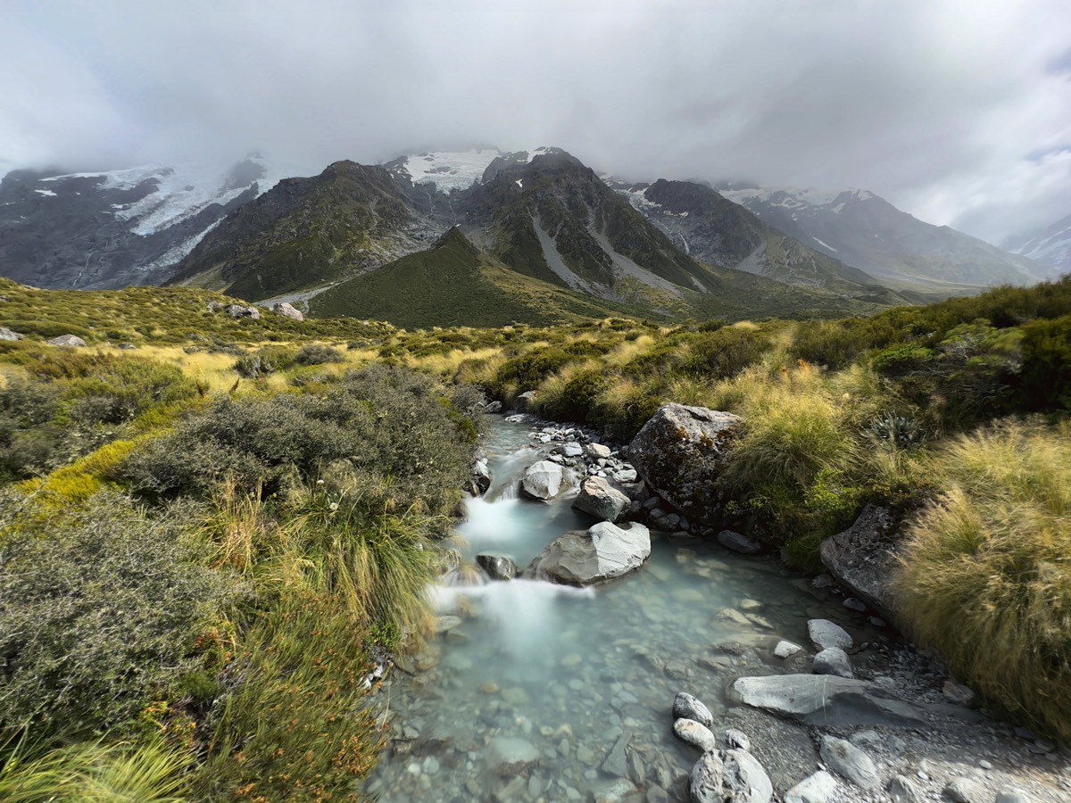 Es ist nicht schwer zu verstehen, warum der Hooker Valley Track so beliebt ist. Es sind 12km zu Fuß, aber es ist einer der einfachsten Spaziergänge, die wir bisher gemacht haben. Man denkt ständig, die Aussicht vor einem könnte nicht schöner werden, aber zwei Minuten später ist die Landschaft noch atemberaubender. Es gibt 3 Hängebrücken zu überqueren und nach der ersten gibt es Mueller Lake Lookout mit erstaunlicher Aussicht.